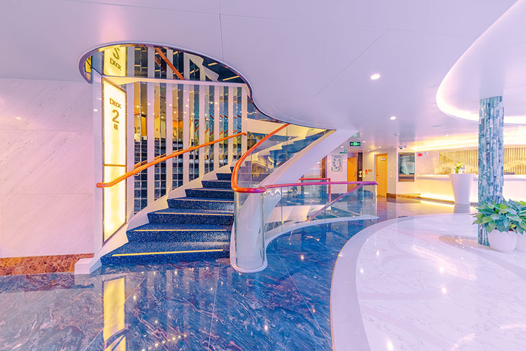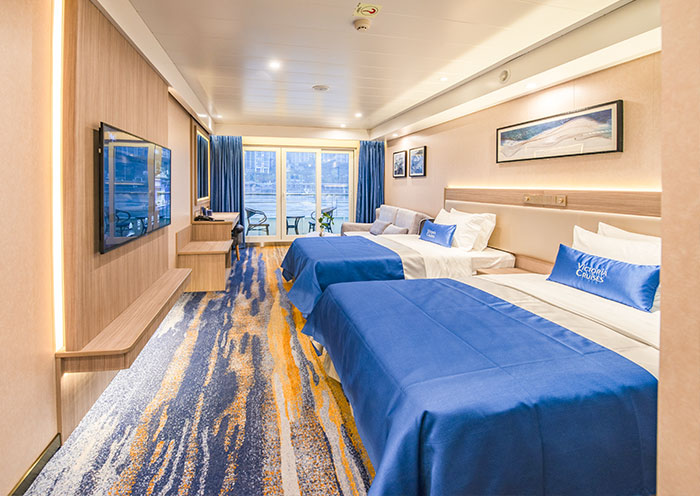 Kruiisilaev on ehitatud vastavalt 5-tärni hotelli nõutele. Laeval on vastuvõtulaud, päikeseterass, massaazi-ja spaaosa, raamatukogu, baar, ööklubi, kauplus. Õhtud on sisustatud elava meelelahutusega. Mugavates ja avarates kajutites on eraldi vannitoad, lisaks ka istekohad ja rõdu. Toitlustamine toimib täispansioni järgi: hommiku-, lõuna- ja õhtusöök (joogid lisatasu eest). Puudub kohustuslik riietumisstiil.