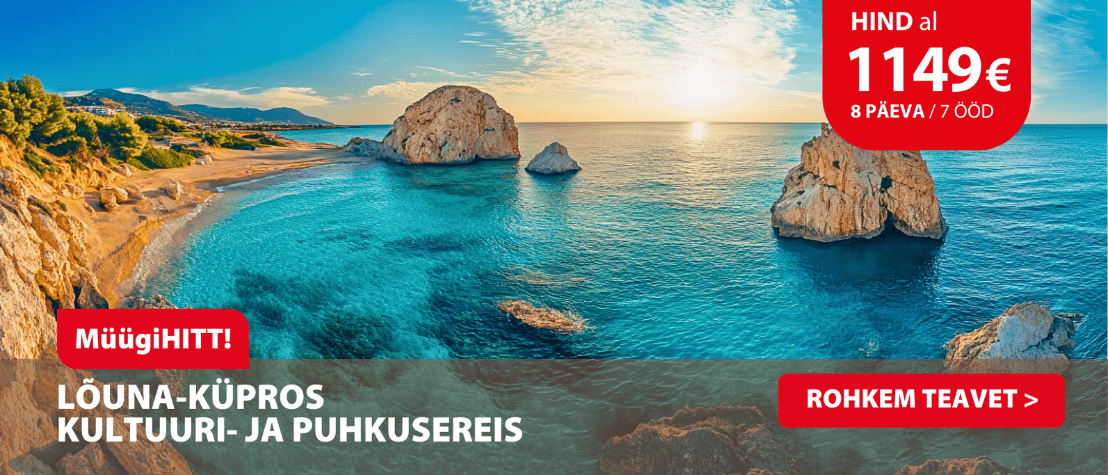 "Käisin reisigrupiga 30.11–06.12 Küprosel. Esiteks tahan tänada büroo töötajaid, kes aitasid lahendada kõik probleemid seoses reisi vormistamisega. Küprosele jõudes võeti meid kenasti vastu ja majutus sujus ilma igasuguste probleemideta. Kõik, mis paketi raames lubatud oli, sai täidetud! Suurim kiitus giididele, kes suutsid juhuslikest inimestest koosneva grupi nii hästi koos hoida, pakkudes meelelahutust ja huvitavaid teadmisi. Eriti tahan kiita meie giidi Kai, kelle teadmised ja oskus seda edasi anda olid tõeliselt nauditavad! Olen reisiga väga rahul ja kindlasti soovitan seda reisi ka tuttavatele." Rahulolev klient Rein
