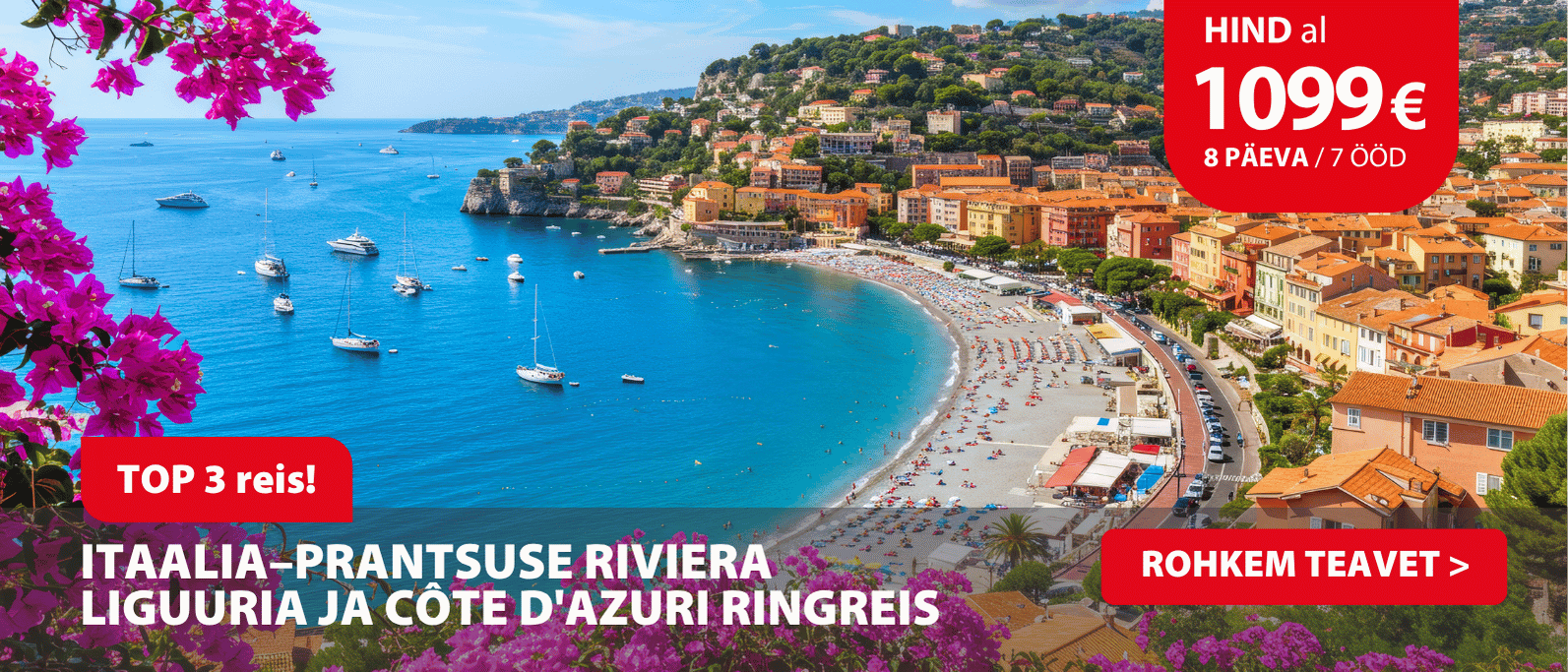 - Ekskursioonipakett (Éze ja Monaco, Genova ja Portofino, Cannes ja Antibes): 179 €/inimene