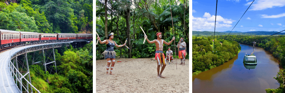 Hommikusöök ning teid ootab ees sõit Austraalia kõige maalilisema rongiga läbi lopsakate vihmametsade, koskede ja mägede hingematval teekonnal Cairnsist võluvasse Kurandasse. Cairnsist veidi eemal vihmametsas asuv Kuranda on tuntud oma turuturgude, käsitööpoekeste poolest. Kurandas ootab Teid jalutuskäik küla hubastel tänavatel, kus on suveniiripoed, baarid, restoranid ja hubased kohvikud. Seejärel külastame Rainforestation Nature Park’i, mis asub Kuranda lähedal Põhja-Queenslandis. Park laiub umbes 100 aakri ulatuses UNESCO maailmapärandi vihmametsa serval. Külastajad saavad avastada Austraalia põlisrahvaste kultuuri, mitmekesist loodust ja kohalikke loomaliike. Sõidame vihmametsas Army Ducki – nii maal kui vees liikuvaga amfiibsõidukiga –, mille käigus giid tutvustab piirkonna taimestikku ja loomastikku. Seejärel naudime vihmametsas kultuuriprogrammi, kus tutvume aborigeenide tantsude, traditsioonide ja muusikaga. Külastame ka koaalade ja teiste Austraalia loomade parki, kus saame näha kohalikke liike, nagu krokodillid, kängurud, dingod, vombatid ja paljud teised. Päeva lõpus naudime sõitu Skyrail köisraudteega, Cairnsi kuulsima transpordivahendiga, mis libiseb vihmametsa latvade kohal ja pakub suurepäraseid vaateid ookeanile ja piirkonna koskedele. Õhtul ootab meid maitsev õhtusöök ühes ehtsat kohalikku kööki pakkuvas restoranis (sisaldub hinnas). Ööbimine Cairnsis hotellis.